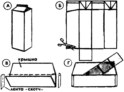 А - исходный пакет, Б - заготовка из него, В - складывание заготовки и скрепление боковин "скотчем", Г - готовый конверт