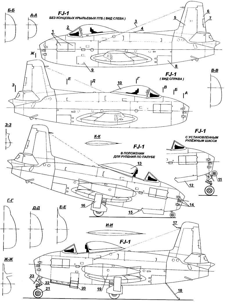 1 - люки доступа к патронным ящикам; 2 - козырек фонаря кабины; 3 - тросовая антенна радиостанции; 4 - проблесковый АНО; 5 - киль; 6 - руль направления; 7 - триммер руля поворота; 8 - тормозной щиток; 9 - откидная подножка (в убранном положении); 10 - сдвижная часть фонаря в закрытом положении; 11 - установка рулежного шасси; 12 - створка ниши уборки носового колеса; 13 - сдвижная часть фонаря в открытом положении; 14 - порты пулеметов; 15 - гак подцепки троса катапульты; 16 - щиток стойки основного шасси; 17 - ПВД; 18 - тормозной гак в выпущенном положении; 19 - концевой крыльевой ПТБ; 20 - откидная подножка в рабочем положении; 21 - колесо основной стойки шасси; 22 - стойка носового колеса; 23 - щиток передней (носовой) стойки шасси; 24 - закрылок; 25 - стабилизатор; 26 - руль высоты; 27 - триммер руля высоты; 28 - триммер элерона; 29 - элерон; 30 - посадочный гак; 31 - посадочная фара (только на правом крыле); 32 - щиток ниши уборки основного колеса; 33 - стойка основного шасси